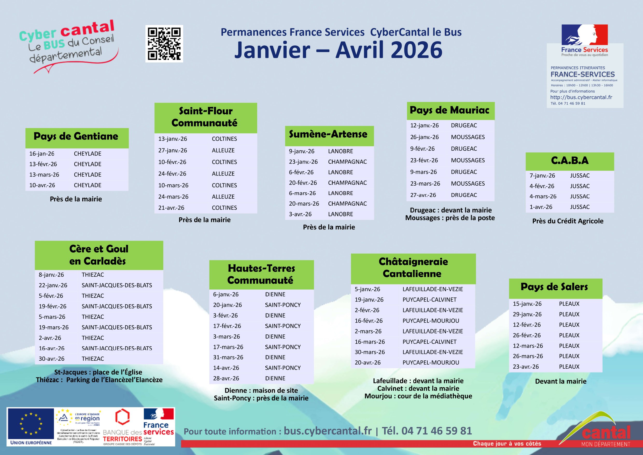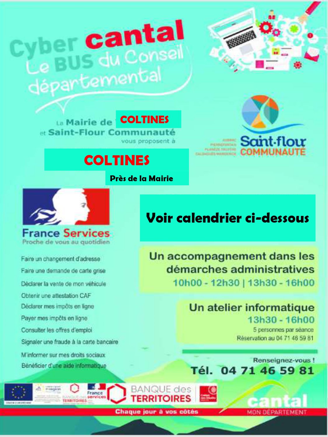 Les permanences France Services CyberCantal le Bus sur la commune de COLTINES pour la période de janvier à avril 2025.